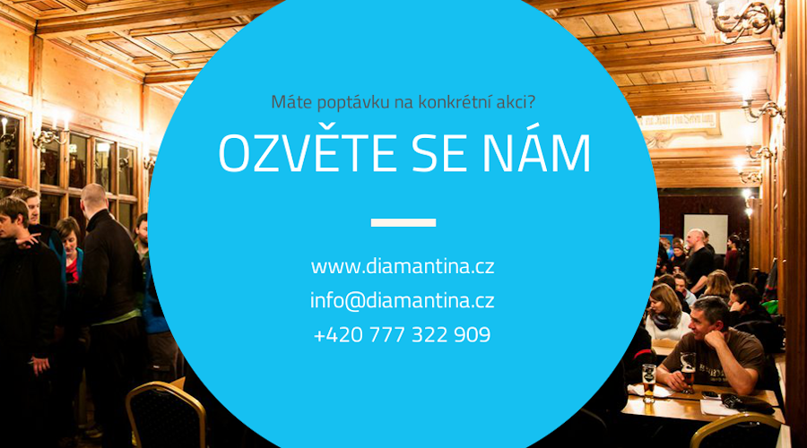 Pro letošní zimu máme nabídku 3 nových Vánočních večírků. VÁNOCE VŠEM - týmová procházka Prahou s úkoly a přesahem do filantropie, SPACE CASINO - obdoba klasického kasína s novými, neotřelými hrami a mezigalaktickou legendou, ZIMNÍ PŘÍBĚH - týmové putování centrem Vánoční Prahy, kde si každý tým s pomocí knihy vytváří svůj zimní příběh. Pro více informací se nám neváhejte ozvat na info@diamantina.cz.